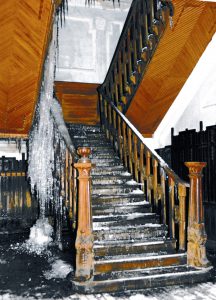 Aber die Gleise, die französische Spurweite hatten, wurden nicht mehr genutzt. Auch der Transport von Waren entfiel, wodurch auch die Einrichtungen zum Umladen dem Verfall preisgegeben wurden. Durch den nur noch eingeschränkten Nutzen des Bahnhofs floß nicht mehr genug Geld für den Erhalt des Gebäudes und so ging es stetig bergab. Nachdem das Dach nicht mehr dicht war, drang Regenwasser ungehindert ein und zerstörte die Inneneinrichtung durch Nässe und Frost von innen. Exemplarisch zeige ich hier ein Bild, das die Treppe im Hotel und den Zustand im Winter zeigt. Und ich danke dem freundlichen Spanier, der es mir überlassen hat.